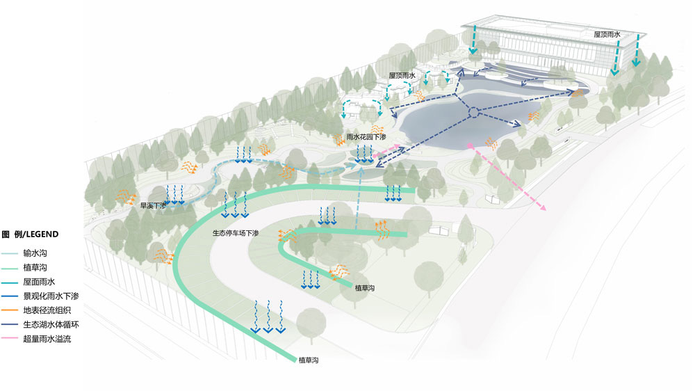 項(xiàng)目現(xiàn)場(chǎng)依形就勢(shì),利用現(xiàn)狀水塑造海綿水系,打造低生態(tài)影響、低維護(hù)的生態(tài)濕地公園;公園綠地依靠雨水花園、下凹綠地等對(duì)雨水進(jìn)行過濾下滲,超量雨水溢流對(duì)湖體進(jìn)行補(bǔ)水;停車場(chǎng)由于汽車帶來機(jī)油和重金屬的影響,不再排入湖體,直接在植草溝進(jìn)行下滲凈化;湖體通過水泵循環(huán)造流,防止水系局部富營養(yǎng)化,并通過植被群落配置及各類生物,構(gòu)建穩(wěn)定的水生態(tài)系統(tǒng)。