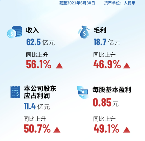 2021年上半年,集團業(yè)績實現高質量發(fā)展。公告顯示,集團上半年營業(yè)額為人民幣62.47億元,較去年同期增長56.1%;毛利18.73億元,同比增加46.9%,毛利率為30.0%;股東應占利潤為11.42億元,同比增加50.7%。每股基本盈利為0.85元。
