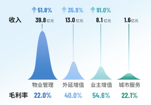 通過精細化運營及科技賦能,雅生活集團運營效益穩(wěn)步提升,收入結構進一步優(yōu)化,核心業(yè)務占比提升至近八成,核心業(yè)務毛利占比超七成。其中,物業(yè)管理服務收入同比增長51.8%至39.77億,外延增值服務收入同比增長35.9%至13.03億元,業(yè)主增值服務收入同比增長90.9%至8.07億元,城市服務收入達1.59億元。
